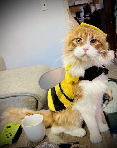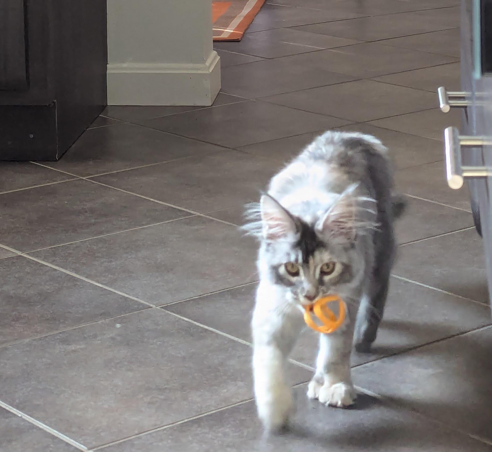 Here’s a recent photo of my boy. He’s doing excellent,  he just had an annual check and he is close to 20 pounds.  I’m teaching him a few words and he tries to teach me his sounds and signals.  I get a nose kiss when I put his food down. He won’t eat until he puts his nose up for a kiss to say thanks mom.  And he follows me into the bathroom and will sit on my feet. He will give me that look that says pick me up for snuggles. So good.  He’s tall enough now to reach up to the kitchen counter and swipe anything he sees haha his favorites are pull tabs from drinks and strips pulled off containers.  He carries them around like special treasures and stashes his collection under the edges of my carpets lol. Never boring and always fun.  I hope the kitties are well and you’re all good.  Take care