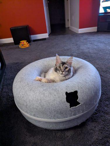 Wanted to write you about Mylie and how much we loooove her. She’s grown so much, both in personality and size. She’s a hoot in the morning. Every day she wakes us up with her chirps and scratching at the bed (bugger). We feed her and then she’s ready to play! She loves these plastic springs we had from our previous cat, hiding in her new cat cave and grabbing the ball out of her track ball game. She’s a smart one! She’s about 10lbs now, full of fluff with a side of naughty. She loves to climb and explore and get as dirty as she possibly can. We love her so much. We hope you’re well and life is good for you.
