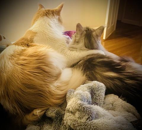 Although Barnaby lives with me in Boston, he loves visiting Junior up in NH. They definitely know they’re related, and spent days on end talking, playing, and grooming each other. I’ve attached some photos of both of them, Barnaby is the smaller and more orange handsome man.